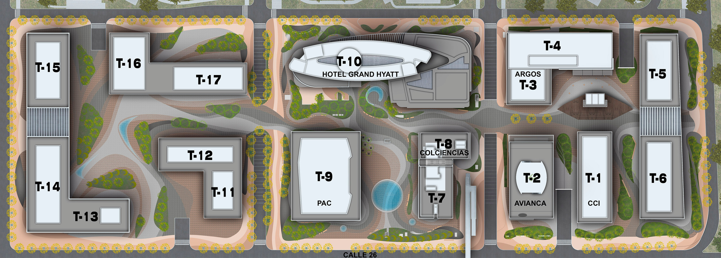 El desarrollo ocupará nueve hectáreas con 18 torres que tendrán un área útil cercana a los 330 mil m2. El destino principal es oficinas, pero también incluye 21 mil m2 para comercio en los primeros pisos, un hotel y un centro de eventos y convenciones. Las circulaciones vehiculares y los parqueaderos, para cerca de 7.700 vehículos, se desarrollarán en tres sótanos. En total son cerca de 600 mil metros cuadrados de área de construcción.